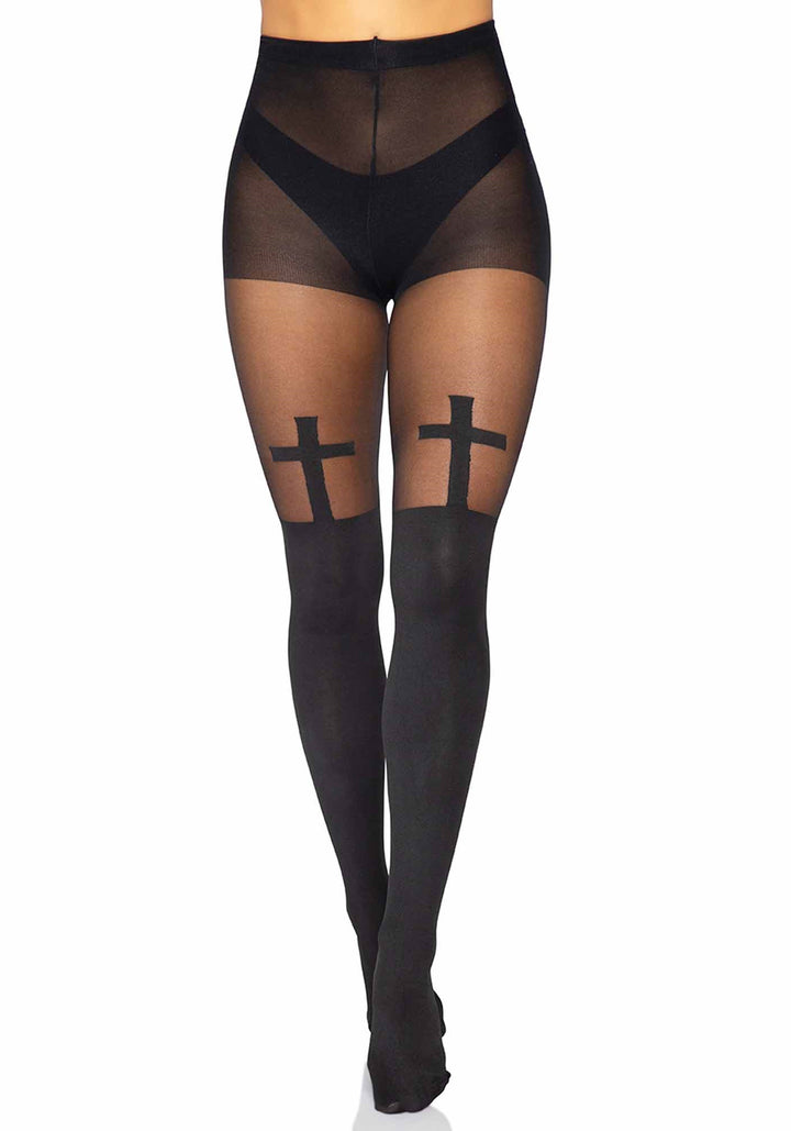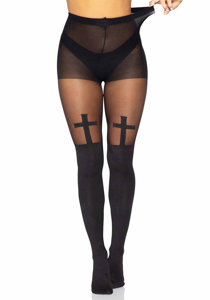 Spandex ogenomskinliga strumpbyxor med korstryck, med transparent lårdekor